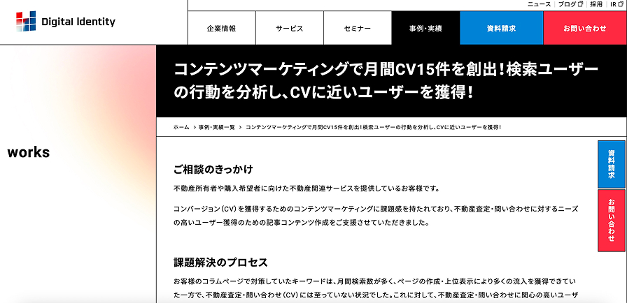 不動産関連サービスのコラム改善で、「流入はあるのにCV(査定・問い合わせ)につながらない」課題を解決した事例です。デジタルアイデンティティは、月間検索数の大きいキーワード中心だった既存方針を見直し、競合の流入キーワードやCVに至る検索ユーザーの行動を調査したうえで、売却検討度の高い層を取りにいくキーワード設計へ転換。新方針に沿って記事制作・改善を進めた結果、CVRが改善し、前年同月0件だったコラム経由CVが3カ月で15件に到達しました。