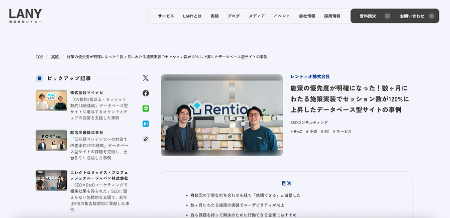 AI検索(Google AI 自然検索流入を伸ばしたい一方で、施策が多すぎて優先順位が決められず、人的リソースも不足して進まなかった、カメラ・家電レンタルサービス「Rentio」を運営するレンティオに対し、LANYがSEOコンサルで伴走。数ヶ月にわたり打ち合わせを重ねて施策を整理し、意思決定を加速。ファセット検索(絞り込み)など大規模改修を実装・リリース。UXと検索評価が改善し、自社施策との相乗効果でデータベースページのセッション数が支援前比120%増を達成。.txt/llm-sitemap.xml設置、構造再設計、エンティティ定義最適化、外部連携を1ヶ月で実行。約1.5ヶ月でAI Overview言及数が約3倍、平均順位も18〜19位から3位へ改善しました。